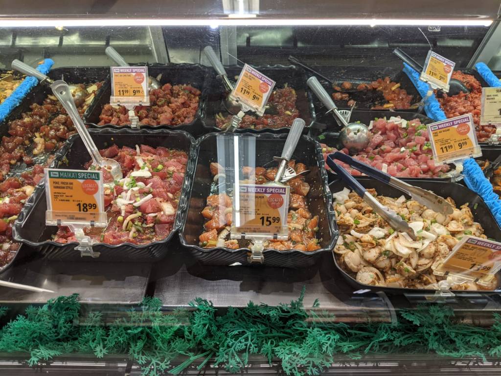 Foodland, as mentioned in our previous article, is one of the few local grocery supermarkets in Hawaii. Every Foodland has a deli counter where they offer surprisingly super good poké, and is the signature go-to among locals. The fish here is from previously frozen fish, but packs tremendous flavor. Foodland poké is friendly to the wallet, where fish runs from $11.99 to $15.99 per lb, and cooked seafood from $15.99 and above. You purchase this by weight, and can buy it a la carte or with rice.
