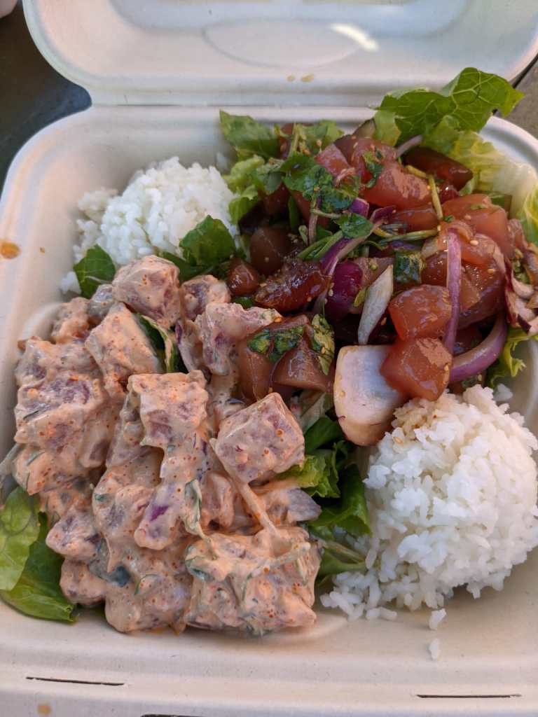 Located across from Costco in the eponymously named “Costco Food Trucks” area is Like Poké, a staple among locals for their huge portions of heaping, fresh fish. They offer four distinct flavors: Shoyu Ginger (sweet style); Shoyu Wasabi (sweet style with a kick); Spicy (creamy sriracha style); and Hawaiian (traditional, savory salty style). Their poke bowls include a half pound of fish, served on a bed of greens with two scoops of rice – absolutely massive! These were priced at $15-$16 previously, but with higher fish prices for fresh fish hitting the island, are set to market prices now which is about ~$20. Still an excellent value for the portions you are getting.